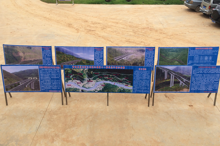 該效果圖展板包括標(biāo)段總平面圖、標(biāo)段內(nèi)控制性工程古那灣連續(xù)剛構(gòu)橋、松園橋互通立交及連接線、古那灣2號(hào)隧道及忠義3號(hào)大橋、兩家村1號(hào)大橋、兩家村2號(hào)大橋、兩家村3號(hào)大橋共計(jì)7幅。