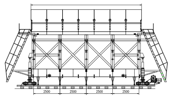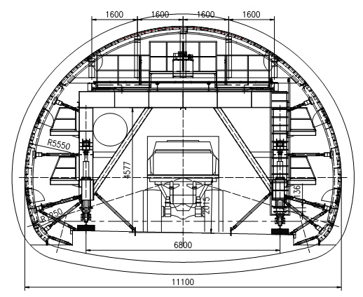 二襯臺車主要由模板總成、頂模架體、平移機構總成、門架總成、主從行走機構、絲杠千斤頂、液壓系統(tǒng)、電氣系統(tǒng)等組成。臺架采用裝載機和挖掘機配合安裝,模板安裝時,主要使用挖掘機配合人工進行安裝。二襯臺車用于對隧道內(nèi)壁的二襯砼襯砌施工,也是隧道施工過程二次襯砌中必須使用的專用設備。當隧道掌子面(左右洞)施工達到80米后,在洞口處拼裝二襯臺車。