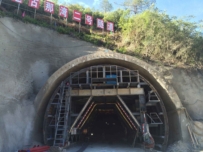 古那灣2號隧道為分離式隧道,左右幅隧道間凈距約介于18~45米,左幅長度1693.96米,起訖里程K94+386.04~K96+080,右幅長度1650米,起訖里程YK94+415~YK96+065,合計全長3343.96米。單個隧道內(nèi)輪廓凈空寬度11.00米,凈空高度7.1米。隧道進出口均采用端墻式洞門,設計有4處緊急停車帶、2條車行通道和3條人行通道。