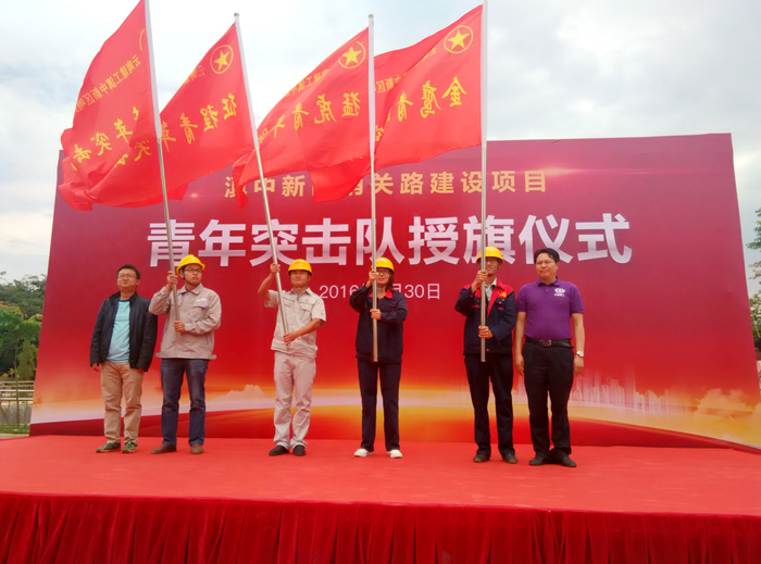 滇中新區(qū)哨關(guān)路建設項目共計8支青年突擊隊,由各個參建單位分別組建而成,路橋總承包部黨總支書記李家舜、集團團委副書記楊瑜、滇中新區(qū)哨關(guān)路建設指揮部副指揮長閉春華和哨關(guān)路投資建設有限公司工程部部長程剛為青年突擊隊授旗。公司“金鷹青年突擊隊”由公司路橋一部項目經(jīng)理王孝生擔任隊長,項目部35歲以下青年職工共計17人組成。根據(jù)青年突擊隊競賽考核書,本次青年突擊隊競賽活動從2016年6月1日至2016年12月31日止,以“安全、質(zhì)量、進度、創(chuàng)新、技能和形象”為主題開展。