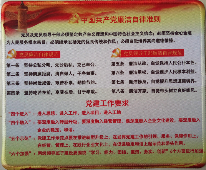 直管部推出每天5分鐘,聽音頻、學黨章,讓黨員同志更簡單、更輕松的將黨章內(nèi)容牢記心中。除此之外,直管部將工程項目展示圖與黨員領(lǐng)導干部廉潔自律規(guī)范、黨建工作要求的內(nèi)容和印有“愛崗敬業(yè)珍惜崗位 誠實守信 依法經(jīng)營”企業(yè)文化的鼠標墊發(fā)放給全體員工。在宣傳企業(yè)文化的同時,讓更多的黨員同志能夠發(fā)揮先鋒作用,帶動更多的人,將學習的理論知識通過實踐、實踐、再實踐。