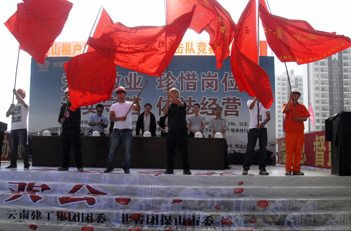 活動(dòng)中,周炳軍作了動(dòng)員講話,并從找準(zhǔn)結(jié)合點(diǎn)、落實(shí)著力點(diǎn)、培育閃光點(diǎn)三個(gè)方面對(duì)青年突擊隊(duì)提出了要求;保山市棚戶區(qū)改造項(xiàng)目指揮部指揮長施旭升對(duì)競賽的相關(guān)工作做了安排;楊瑜宣讀了青年突擊隊(duì)競賽方案,競賽從五位一體、創(chuàng)新、育人、形象方面開展,既可以更好地促進(jìn)工作任務(wù)的完成,還能打造出一支朝氣蓬勃的青年人才隊(duì)伍。隨后,來自四公司、五公司、七公司、總承包公司、十公司、云海公司的青年突擊隊(duì)隊(duì)長依次上臺(tái)作了表態(tài)發(fā)言,并由參會(huì)領(lǐng)導(dǎo)向各參賽隊(duì)伍授予“青年突擊隊(duì)”旗幟。隊(duì)員們揮舞起自己的隊(duì)旗,激情的口號(hào)聲在工地響起,啟動(dòng)儀式圓滿結(jié)束。