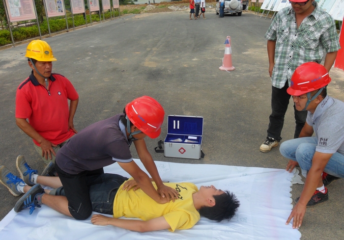 在安全管理員的指揮下,參演人員被分為3個(gè)組,每組4名成員進(jìn)行安全演練。下午兩點(diǎn)多,隨著“受傷人員”被擔(dān)架抬出,救援演練正式開始?!皞麊T”平躺于急救擔(dān)架上,每組人員分別演練了嘴鼻放氣、口對(duì)口人工呼吸和心臟擠壓等急救方法。在演練的過程中,大家邊操作邊講述急救要領(lǐng),理論和實(shí)際操作相結(jié)合起來,收到了良好的效果。
